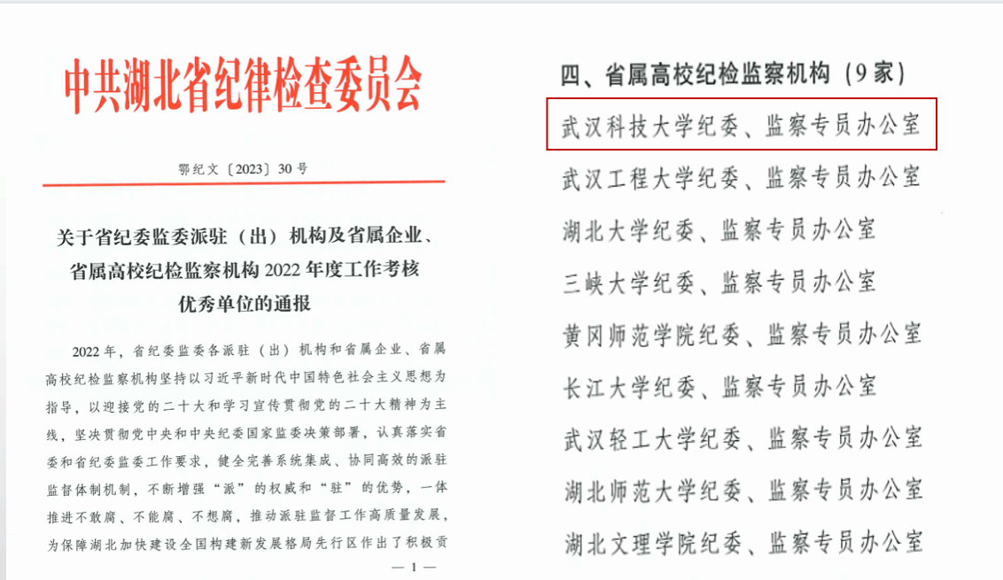武科大网讯 近日,湖北千亿国际网页版登录发布《关于千亿国际网页版登录派驻(出)机构及省管企业、省属高校纪检监察机构2022年度工作考核优秀单位的通报》,我校纪委、监察专员办公室被评为“2022年度工作考核优秀单位”,考核排名位居首位,连续第四年被千亿国际网页版登录评为“优秀”等次。