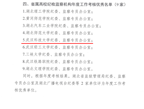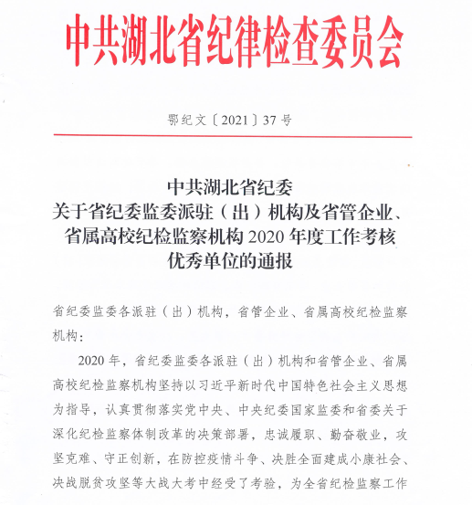 近日,湖北千亿国际网页版登录发布《中共湖北省关于千亿国际网页版登录派驻(出)机构及省管企业、省属高校纪检监察机构2020年度工作考核优秀单位的通报》(鄂纪文〔2021〕37号),我校纪委、监察专员办公室被评为2020年度工作考核优秀单位。